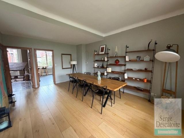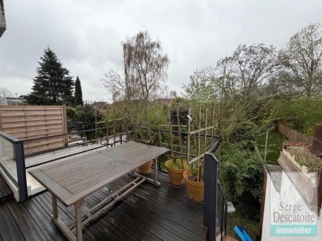 Maison à vendre à Marcq en Baroeul située entre le Croisé Laroche et la Mairie. Maison style bel étage comprenant: Un bel espace de vie accès sur une terrasse bien exposée au calme, cuisine équipée. A l'étage 3 chambres et salle de bain. Au rdc deux bureaux avec entrée indépendante et une chambre accès jardin (dressing et salle de douche). Buanderie et garage.