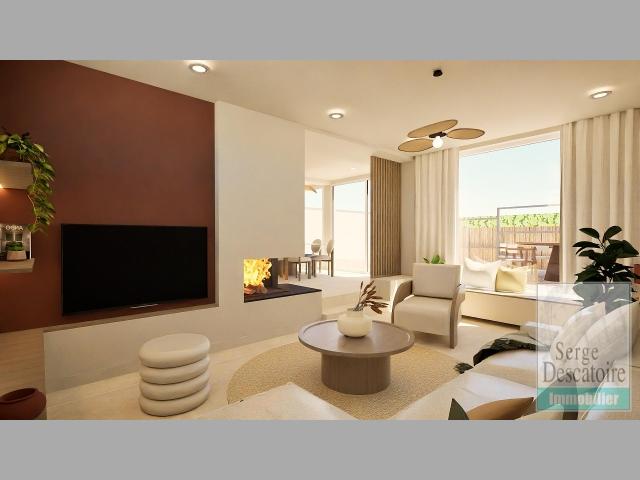 Un hall d'entrée, bureau, belle pièce à vivre d'une surface de 60 m² (cuisine équipée, salle à manger et salon cheminée feu de bois) accès sur une terrasse de 40 m² sur jardin sans vis à vis.